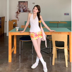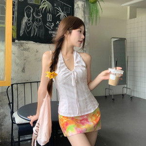 法式复古小清新纯欲风女背心吊带夏季辣妹挂脖系带修身显瘦小上衣