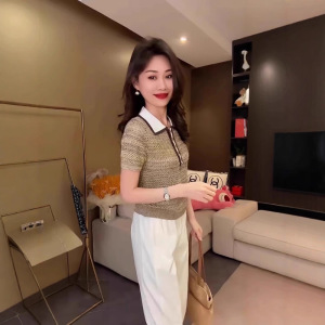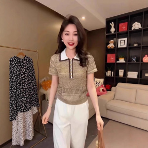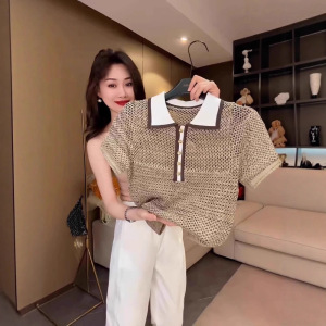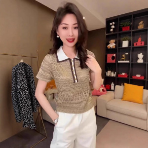 小香风撞色polo领镂空冰丝短袖针织衫女夏季新款正肩t恤独特上衣