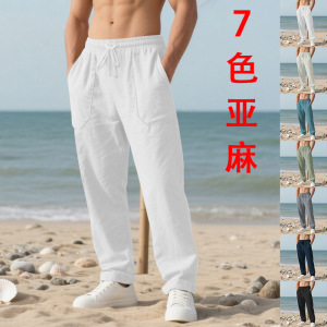 跨境亚马逊秋季新品热卖宽松亚麻男士沙滩休闲简约运动大码长裤