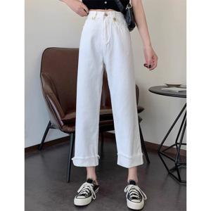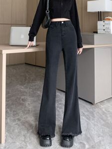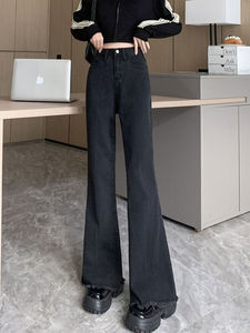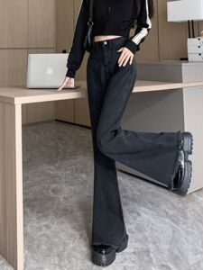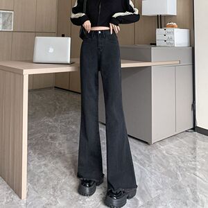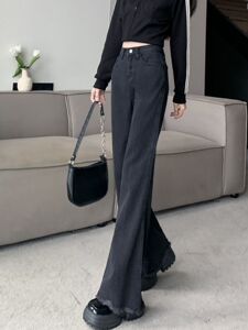 秋の女性用ブラックブーツカットジーンズ、ハイウエスト、ルーズ、ワイドレッグ、馬蹄パンツ、多用途のローエッジパンツ