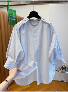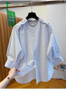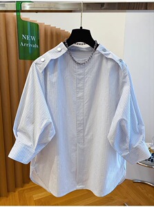夏季新款蓝色条纹短袖衬衫大码女装胖mm高级感五分袖遮肚衬衣上衣