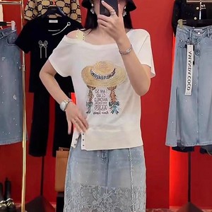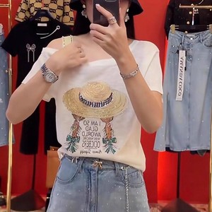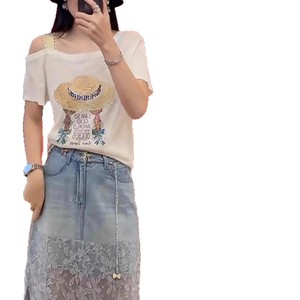 フレンチオフショルダーファッションプリントTシャツ女性用2025夏新スタイルヘビーデューティホットダイヤモンドデザインルーズスリム半袖トップ