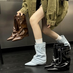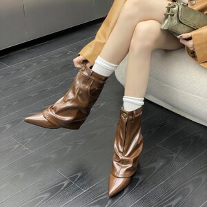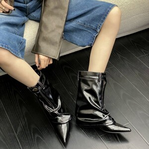圆头细跟短靴女2025秋冬新款欧美高跟小众裤管靴短筒侧拉链瘦瘦靴