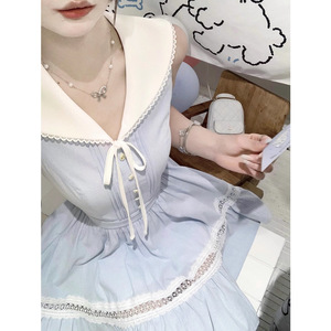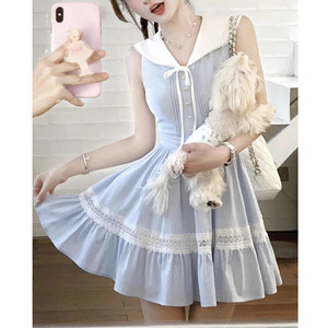 Sweet Blue Island Diary/海軍アカデミースタイルガールブルーストライプウエストシャツドレスノースリーブショートスカート夏