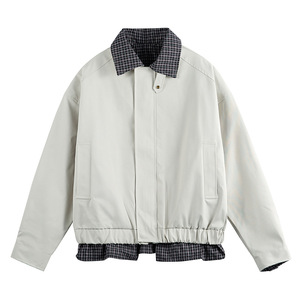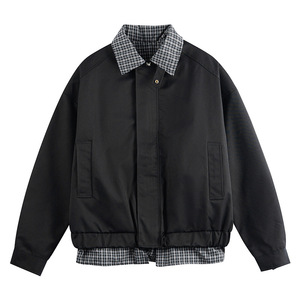 黑杏格子撞色翻领个性假两件夹克外套男女秋季宽松休闲设计感上衣