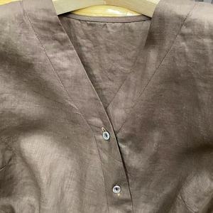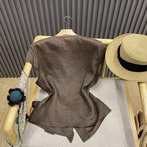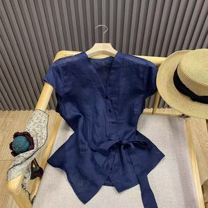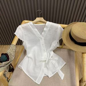 不规则V领短袖苎麻小衫系带减龄设计感纯色百搭收腰上衣女C88131
