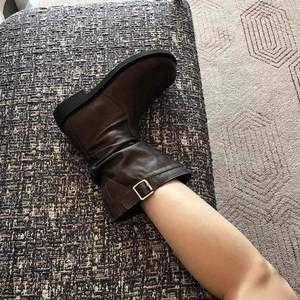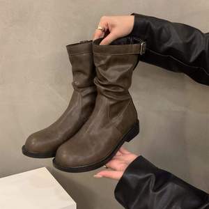 韩系粗跟小短靴女2025新款春秋棕色复古圆头褶皱堆堆靴中筒马丁靴