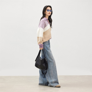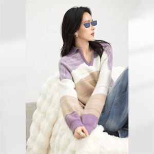 对白宽松软糯撞色翻领套头毛衣女2025秋季新款慵懒休闲小众针织衫