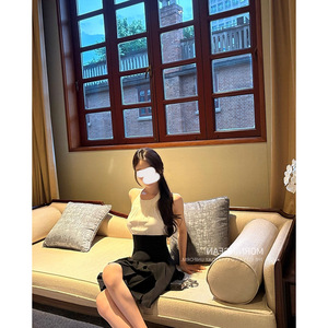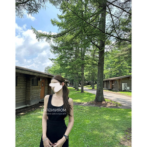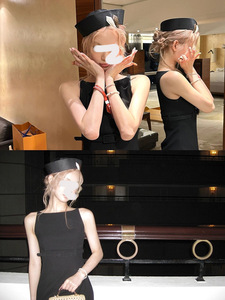 早安樊樊「Rachel」黑色修身连衣裙女平领无袖/侧边镂空/撞色裙子
