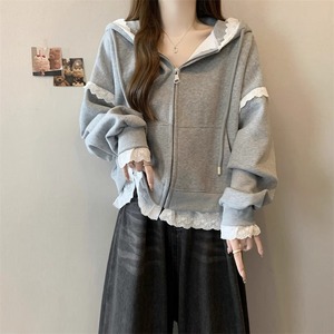 欧货连帽卫衣开衫外套女春秋新款大码胖mm显瘦高级感蕾丝花边上衣