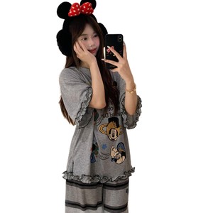 【现货】米奇木耳边短袖睡衣女款夏季宽松慵懒条纹长裤家居服套装