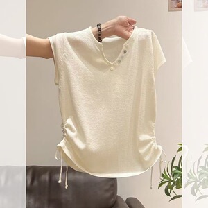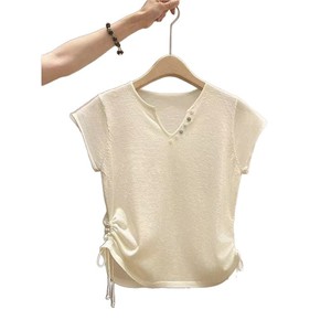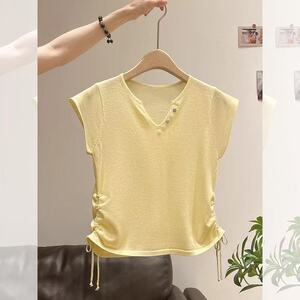 人気のアプリコット V ネック半袖 T シャツ女性の夏の新しい薄いアイスシルク巾着プリーツウエスト痩身ショートトップ
