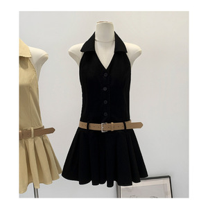デザインされたホルターネックバックレスポロカラーベストドレス女性のための 2025 夏ウエスト痩身ノースリーブプリーツスカート