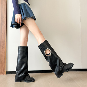 孟子义同款复古方头西部牛仔靴百搭粗跟裤管靴小众设计胖mm长筒靴