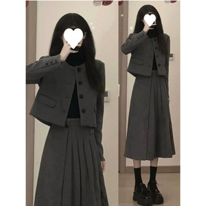 秋冬盐系穿搭套装女小个子气质短款毛呢外套半身高腰百褶裙两件套