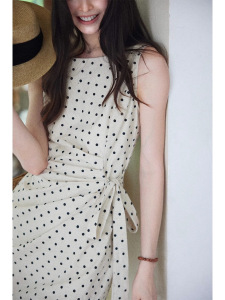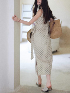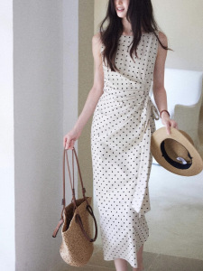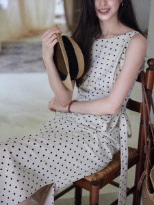 デザイン【松間月】高級気質水玉ドレスレディースサイドウエストリネンコットンフレンチロングスカート