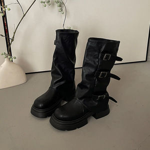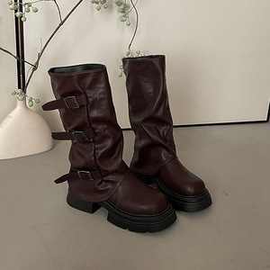 女性用プリーツ太ヒールミッドカーフブーツ、ファッショナブルで多用途なバックル付き2025秋冬新作厚底ウエスタンカウボーイブーツパイルブーツ