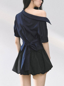 曼斯旧街%高级感法式露肩T恤女夏收腰显瘦短袖上衣通勤衬衫