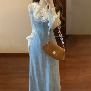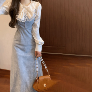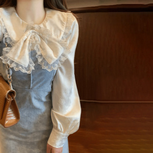 【蔓雪芊】法式复古蝴蝶结提花衬衫收腰灯芯绒背带连衣裙两件套装