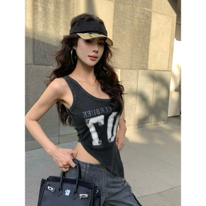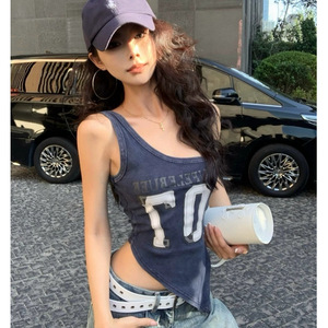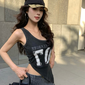 夏季修身无袖外穿设计感辣妹内搭上衣美式字母印花斜肩吊带背心女