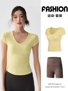U领新款瑜伽套装上衣女修身T恤薄款透气普拉提跑步训练短裤速干夏