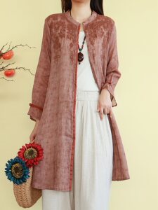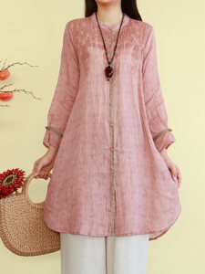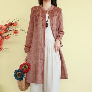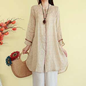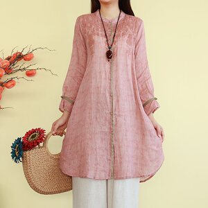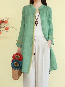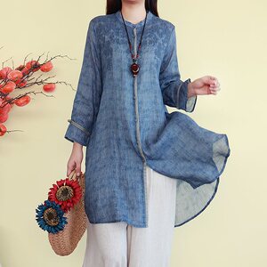 新しい中国風のレトロな綿とリネンの日焼け止めシャツ女性のための夏のルーズ国民風刺繍ミッドレングス薄いリネンカーディガントップ