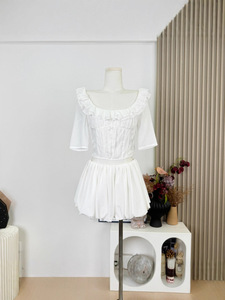 【少女莉莉安】法式u领莱赛尔上衣低腰蕾丝花苞蓬蓬裙套装