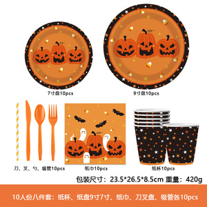 新款万圣节紫色南瓜鬼节派对用品一次性纸盘纸巾纸杯摆件套装批发