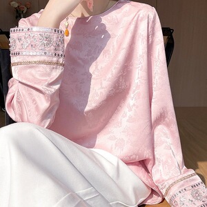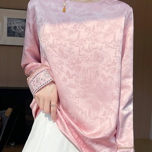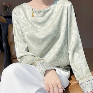 新中式国风提花长袖衬衫女2025年新款醋酸缎面薄款圆领内搭打底衫