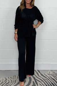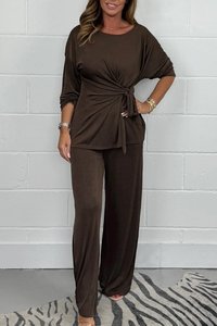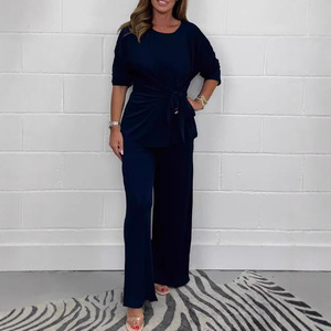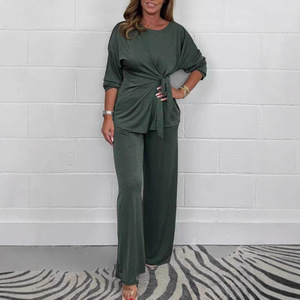 亚马逊欧美跨境2025秋季女装纯色休闲时尚系带长袖上衣和长裤套装
