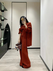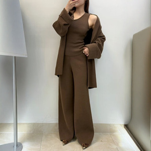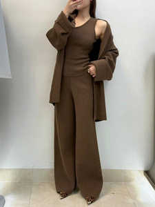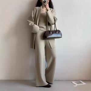 跨境气质通勤针织套装女秋冬加厚开衫外套+单肩背心+阔腿裤三件套