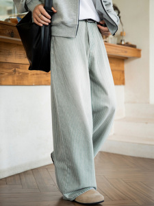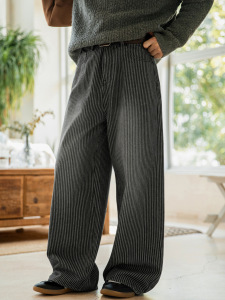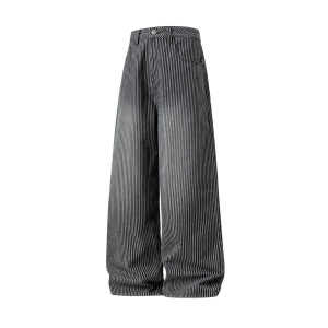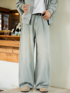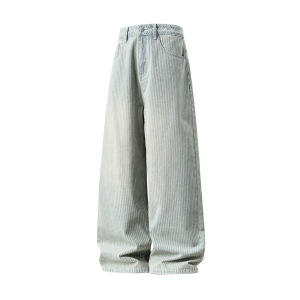 アメリカンレトロな縦縞ジーンズ、メンズ秋スタイル、ゆったりとしたトレンディなブランドストレートパンツ、ウォッシュド加工のロングパンツ
