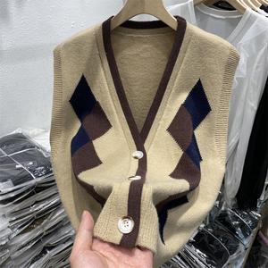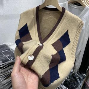 V领菱格坎肩打底马甲2025秋冬新款设计感小众针织开衫背心女上衣