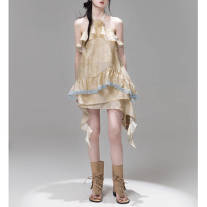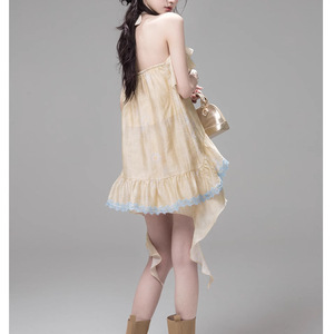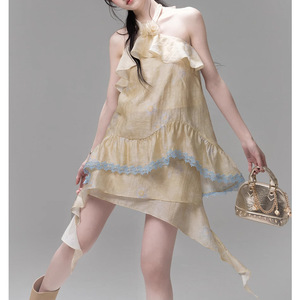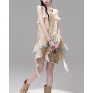 サマーミュージックフェスティバル アプリコットサテン フェザーリヨセル ホルターネック プリントトップ+スカート ツーピーススーツデザイン