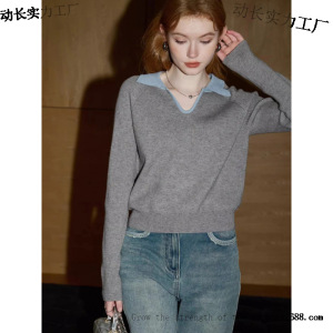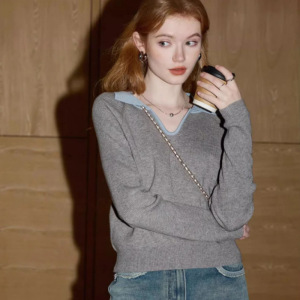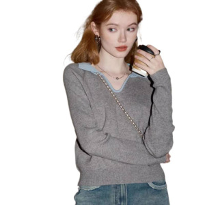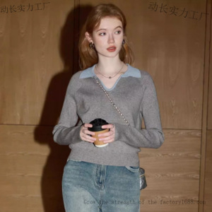 库恩玛维灰色长袖针织衫女年秋季新款名媛气质领翻领小毛衣