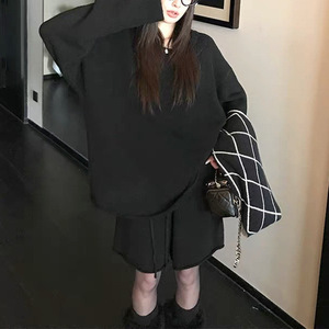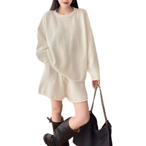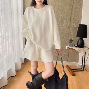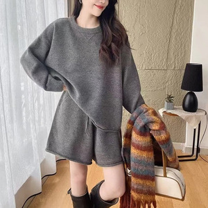 2025新款韩版秋季纯色慵懒风宽松休闲圆领毛衣高腰短裤针织套装女