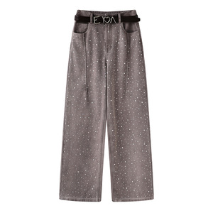 2025秋季新款女装休闲高腰带直筒烫钻牛仔裤直筒长裤子RL71302052