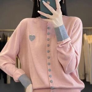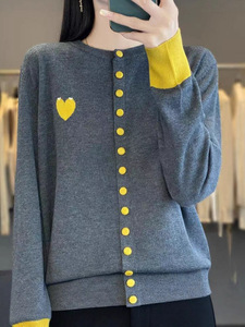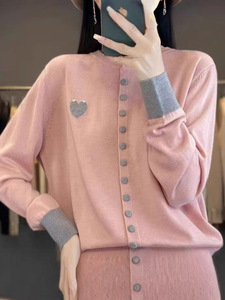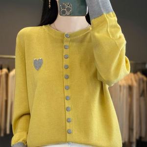 2025撞色拼接爱心刺绣圆领毛衣开衫女秋季设计感气质显瘦针织上衣