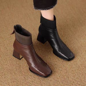 气质拼接针织中跟软皮瘦瘦靴2025秋冬新款复古粗跟后拉链马丁靴女