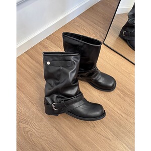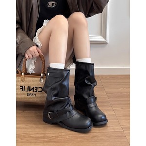 牛皮款~复古褶皱堆堆靴女粗跟黑色中筒靴西部靴马丁靴骑士靴