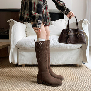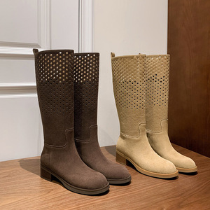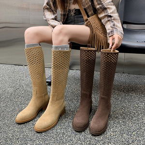 辣妹穿搭!2025真皮镂空复古洞洞时尚不过膝长筒靴粗跟气质骑士靴