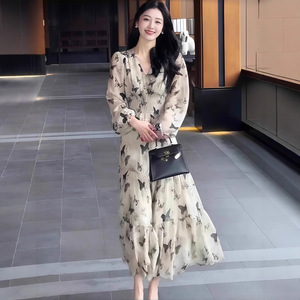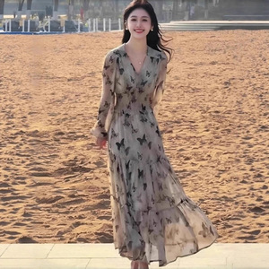 蝶花柄ドレスレディース秋冬新作フレンチVネックインクプリント長袖ウエスト痩身ロングスカート