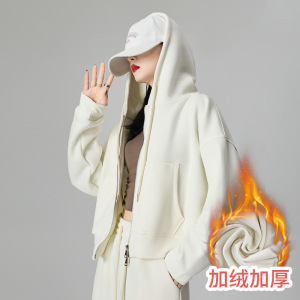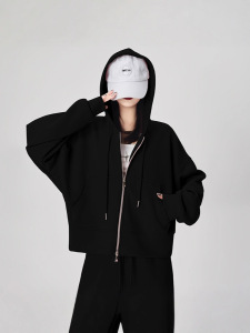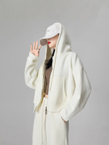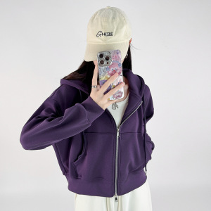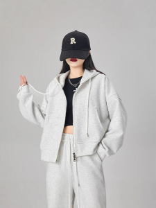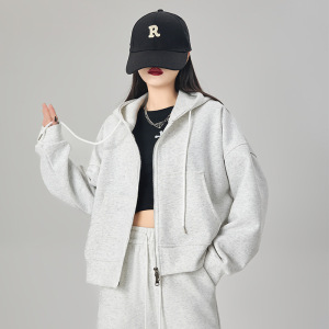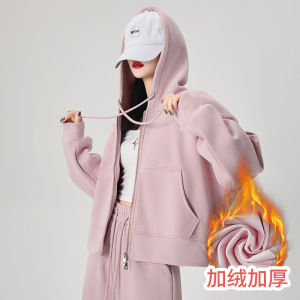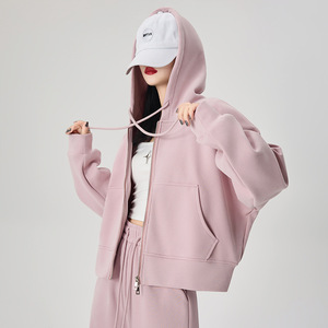 ピンクのジッパー付きフード付きスウェットシャツ、女性用、初秋、小柄な人向け、韓国風、ゆったり、着痩せ効果、秋冬万能、裏起毛ジャケット