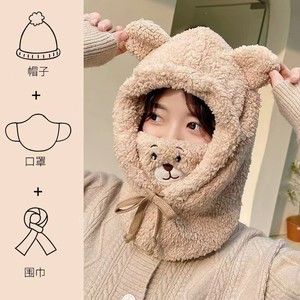 小熊毛绒帽口罩帽子围巾一体冬天女骑车防寒保暖帽子女秋冬套头帽
