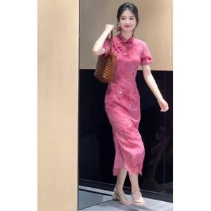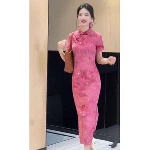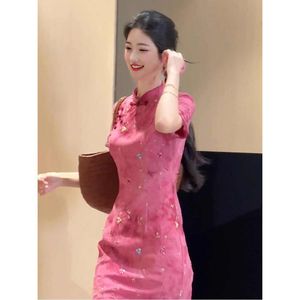 复古新中式玫红色碎花改良日常旗袍裙大方得体收腰包臀气质连衣裙