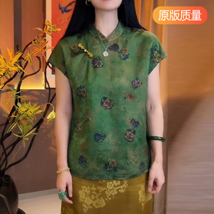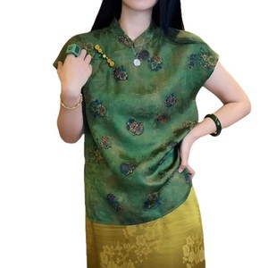 新しい中国風の改良されたチャイナドレストップ女性の半袖夏の新緑の中国風のシャツシルクマルベリーシルクシャツ