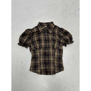 韓国の甘い女の子のカレッジスタイルのパフスリーブシャツ、不規則な裾、ウエスト痩身シングルブレストカーディガントップ