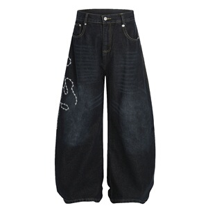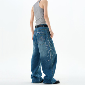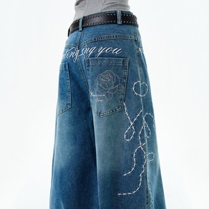 FHGFF美式高街玫瑰刺绣阔腿弯刀牛仔裤男女街舞潮牌宽松休闲裤子