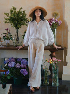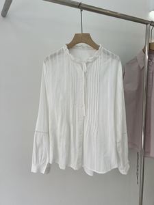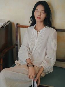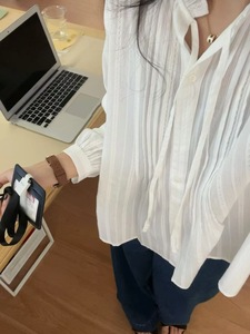 法式秋日慵懒感飘带木耳领肌理感白衬衫女度假风宽松泡泡袖衬衣ZW