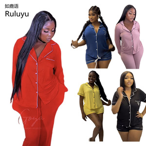 亚马逊跨境欧美家居服套装开衫短袖衬衣短裤夏季睡衣女外贸独立站